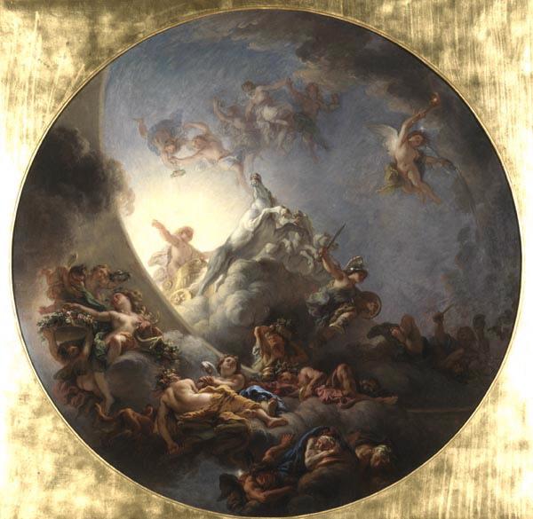 esquisse pour la partie centrale du plafond commandé en 1672 par Louis XIV pour le Salon d'Apollon au château de Versailles : le lever du soleil (inv MV 8486, inv 4532) ; autre esquisse préparatoire par La Fosse au musée de Marseille ; esquisse oeuvre en rapport Choisy-le-Roi (provenance, ?)