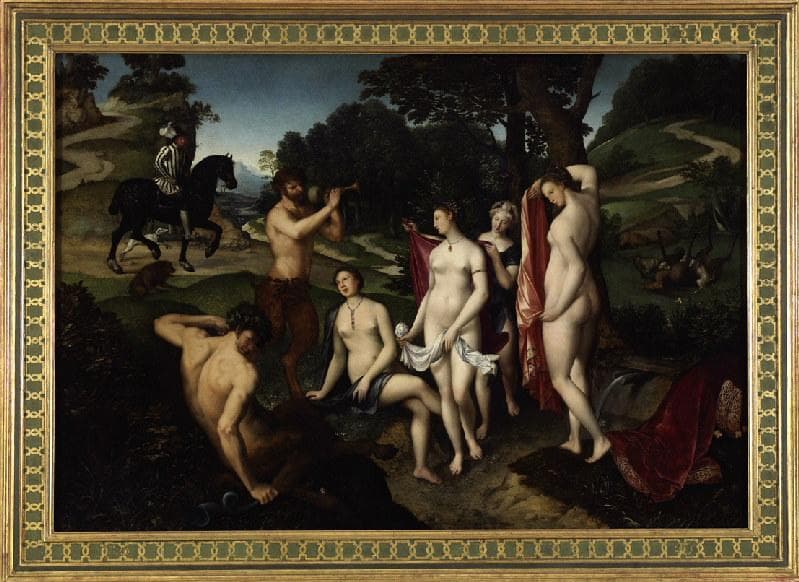 Ce bain de Diane cache une énigme : que deux satyres courtisent la déesse de la chasteté à sa toilette au fond des bois avec ses nymphes, est contraire à la vérité mythologique. Son auteur, François Clouet, peintre de la cour de France, montre en réalité ici en langage crypté les plus hauts personnages de cette cour. La nymphe assise au linge noir est Catherine de Médicis, en deuil de la mort d'Henri II (1559). La déesse au croissant et parée de bijoux est Diane de Poitiers, maîtresse d'Henri II qui portait ses couleurs (blanc et noir) dans le tournoi fatal. La nymphe qui tient le voile nuptial antique (couleur flamme) au dessus de la pourpre royale et devant l'iris-lys de France, est Marie Stuart, épouse de François II (1559-1560), nouvelle des Diane mariée par l'entremise de ses oncles les Guise; la fleur de chardon, emblème Stuart, le confirme au premier plan tandis que le lierre, qui couronne un des deux satyres, le désigne comme le cardinal de Guise-Lorraine. Dans ce contexte, le second satyre est son frère François (1519-1563), le militaire, qui claironne victoire. Quant au cavalier au sceptre fleurdelisé, la curée du cerf, au fond, présage du sort qui l'attend : nouvel Actéon condamné par Diane, est-il François II, qui régna un an, ou Henri II, victime de sa Diane ? Cette peinture accuse donc à la fois la favorite, Diane de Poitiers, cause de mort, et les Guise, suppôts du parti catholique qui déchire la cour. Ces clefs, de portée politique, indiquent que l'ouvre a été commandée dans les hautes sphères de cette cour, du côté des Protestants. Les nus féminins stylisés, qui composent un bouquet glacé dans un ample paysage, montrent la dette de Clouet envers l'école de Fontainebleau.