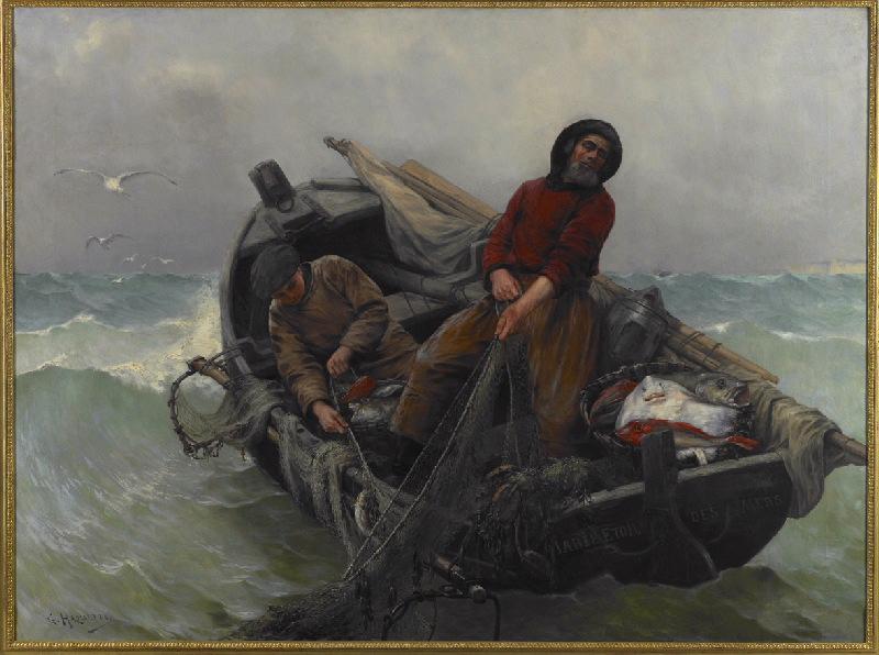 Deux pêcheurs dans leur barque, par gros temps : un jeune et un vieil homme en plein effort, en train de relever leurs filets. A leur côtés, un panier d'osier rempli de poissons : une raie, un rouget, sur le dessus du panier. Derrière eux, reposant sur toute la longueur de la barque, la voile et son mât. La blancheur de la vague déferlant sur l'avant de leur barque apporte à la toile une note claire. mouettes falaise, côtes, voilier, lanterne. Nom de la barque : Marie Etoile des Mers
