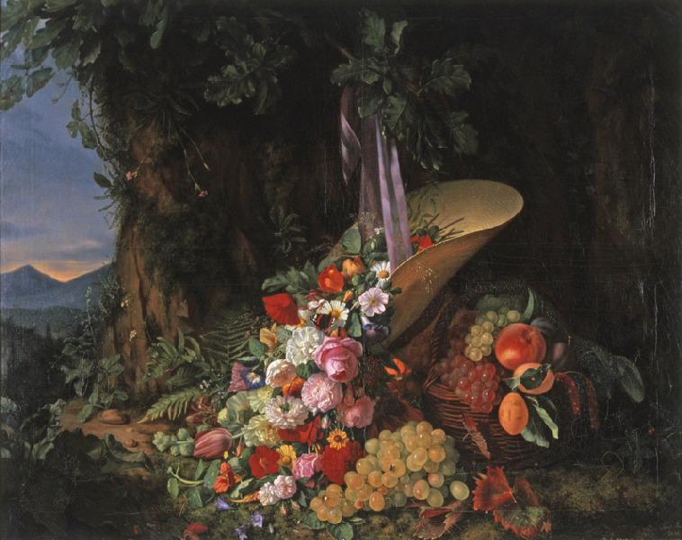 représentation végétale (fruit, fleur, chapeau : paille, panier, branche : chêne, fougère, grotte)