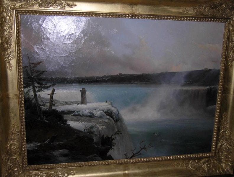Le tableau reprend, vers 1839, la première planche de l'ouvrage, 'vue de la grande chute du Fer à Cheval prise de l'Ile de la chèvres'. La lithographique a été réalisée par J.C. Rémond d'après des dessins effectués par Abel-Guillaume Blouet lors d'un séjour en Amérique (Cf. 'Chutes du Niagara, Niagara Falls', édité chez Delpech, Paris).La chèvre de l'estampe a été remplacée par deux hommes dont Blouet, à qui l'artiste offrit le tableau. ; voir aussi : Portrait d'Abel Blouet, architecte (1887.5.1)