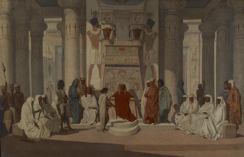 scène (Joseph, roi : Egypte, relation par paroles : songe, haut fonctionnaire : antiquité égyptienne, soldat, prêtre : Egyptien) ; vue d'intérieur (temple : Egyptien, signe alphabétique : Egypte, colonnade, peinture murale ; souverain, homme, assis, de face, Egyptien, trône, couvre-chef ; Joseph, jeune homme, en pied, de profil, communication par le geste)