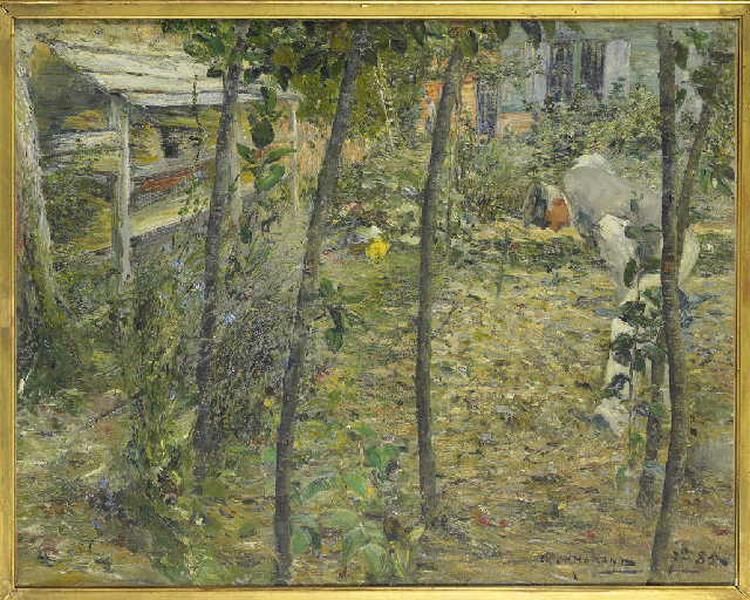 ensemble dispersé : Les choux (1884), pendant de Dans le jardin, actuellement conservé dans une collection publique en Grande-Bretagne ; huile sur papier gris (collection P.M. Angrand, 1982)