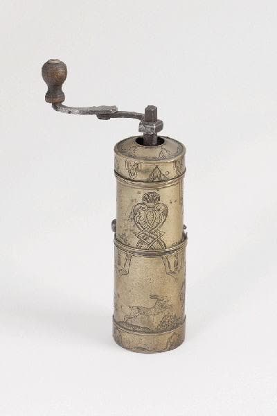 Moulin à café portatif et sa manivelle pliante avec bouton en bois. Sur le bras du moulin à café, sujet de chasse. Un chasseur, deux chiens courant apprès une biche. Au centre, médaillon formé par des ornements surmonté d'une couronne