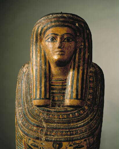 Cercueil anthropoïde interne. Ce cercueil de femme, paré d'un collier-'ousekh' composé de rangées de pétales de fleurs, et dont un faucon à tête de bélier protège la poitrine, se répartit en trois registres séparés par des bandes composées de motifs de plumes tricolores. Au centre, naissant entre les pattes du faucon, une inscription hiéroglyphique court jusqu'aux pieds et est encadrée par deux autres bandes similaires. Six scènes sont ainsi délimitées par le croisement des bandes de plumes. En haut, à droite, Isis, reconnaissable à son nom, protège Osiris enveloppé dans une gaine blanche, dont la silhouette est précédée de ses épithètes. A gauche, les déesses Nephthys et Neith, identifiées par leurs noms, accomplissent le même geste de protection, confirmé par un chapelet de signes-'ankh-ouas' pendant au bras. Derrière les déesses, à droite et à gauche, figure un signe à l'horizon paré d'un double ruban. De part et d'autre de la ligne d'inscription centrale, les quatre fils d'Horus, Amsit et Hapy à droite, Douamoutef et Kebehsennouf à gauche. Au dernier registre figure, dans chaque cadre, un bout d'aile accompagné du nom d'Osiris (G et H).