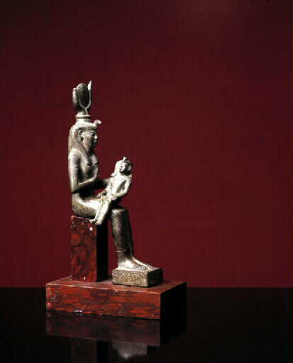 scène mythologique (Isis, Horus, allaitement, couronne, corne, disque solaire, symbole, amour maternel)