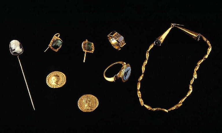 Trésor découvert fortuitement en creusant un fossé à 1 m de profondeur, dans un petit coffret de fer rouillé (non conservé). Ce coffret renfermait deux aurei et six bijoux. Numéros d'inventaire 4827 bis.a à g