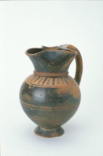 Style corinthien récent I. Cette forme assez rare d'oenochoé à embouchure trilobée, à panse globulaire, concurrence, dans la production corinthienne, au second quart du 6e siècle, l'oenochoé à panse ovoïde, d'origine beaucoup plus ancienne (8e siècle) et de type bien plus fréquent ; elle se retrouve aussi épisodiquement dans la céramique attique à figures noires contemporaine, sous l'influence de Corinthe.