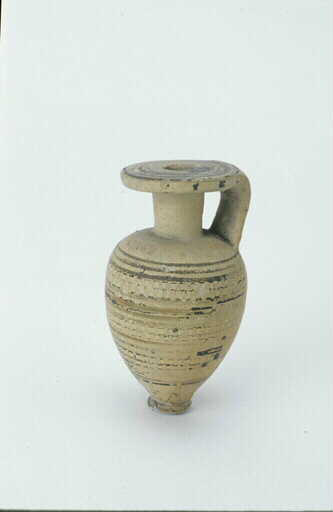 Argile peinte. Panse ovoïde ; goulot et anse plats. Décor linéaire : files de traits verticaux et filets alternés ; arêtes rayonnantes au bas de la panse.
