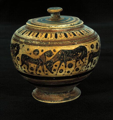 Style corinthien moyen. Attribué au 'peintre de Gélédakis' par Benson. C'est un bon exemple de style corinthien animalier, sans imagination, mais d'exécution soignée : la sirène aux ailes recourbées à leur extrêmité, la panthère, le bouquetin sont caractéristiques du corinthien moyen, de même que la multiplication des rosettes, des taches et des points en sihouette ou à incisions sommaires. La forme de la pysis globulaire apparaît avec le début du 6e siècle.