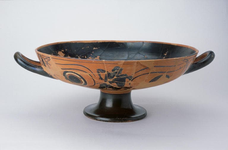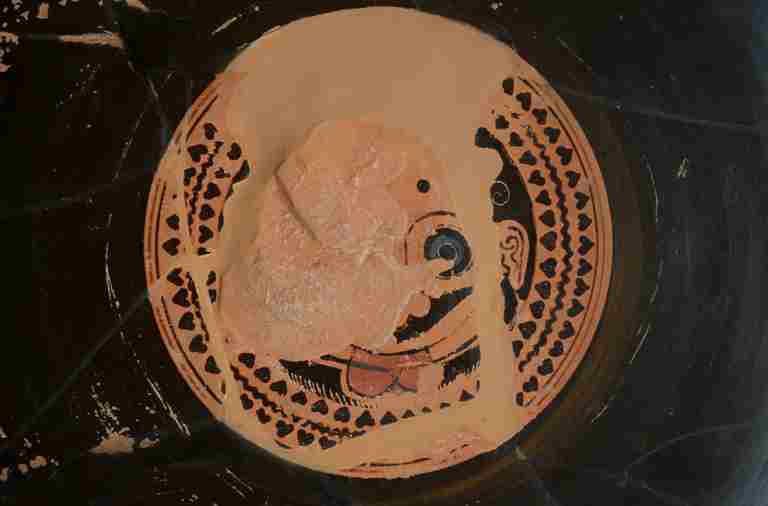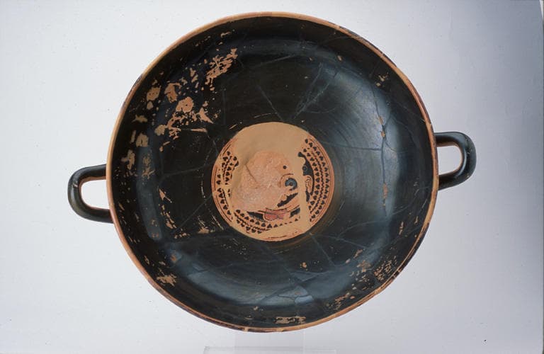 Argile peinte. Sur chaque revers, deux yeux : cercles concentriques noir, blanc effacé, rouge ; pupille noire. EXTERIEUR A : entre les yeux, Athéna casquée, revêtue de l'égide, un bouclier rond au bras gauche, attaque à la lance un géant qui tombe le genou droit en terre. Sa lance est tombée sur le sol, il tient une pierre de la main droite et se protège de son bouclier rond ; sur le bouclier, épisème blanc effacé : un trépied. Sous l'anse gauche par rapport à ce groupe, un jeune homme nu, accroupi, tourné vers la droite, couronné d'un bandeau violet. Des rameaux entrelacés de lierre et de vigne partent des anses. Sous l'anse droite, un satyre accroupi, également tourné vers la droite. EXTERIEUR B : Thésée affronte le Minotaure, monstre à corps d'homme et à tête de taureau. Le héros, couronné de myrte, en chiton court et nébride, armé d'une épée, passe son bras gauche par-dessus l'épaule gauche du Minautore et le saisit au poignet ; il plante son épée dans le dos du monstre qui fléchit les genoux en tournant la tête vers la gauche. INTERIEUR : masque de Gorgone