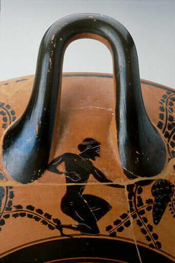 Sous la vasque en haut du pied, est peinte la signature du potier : Nikosthénès époiesen = Nicosthénès a façonné (ce vase).