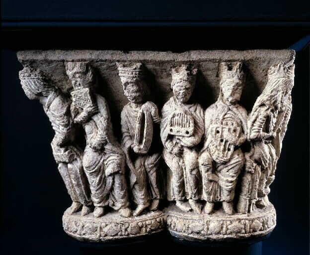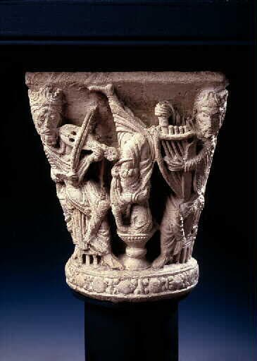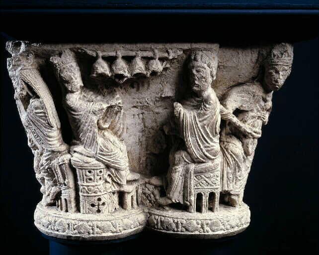 2001.0.138 Chapiteau de Boscherville ; 139.38 (A) Enfance du Christ ; 2002.4 Moulage. Chapiteau qui ornait le cloître construit par l'abbé Victor (1157-1211), il surmontait deux colonnettes géminées