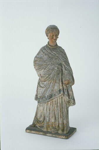 Jeune tanagrienne drapée et coiffée d'un bonnet (sakkos) qui ressemble au fez des grecs modernes. Elles se dirige vivement vers la droite. Son vêtement se compose d'un chiton et d'un péribléma qui enveloppe étroitement le buste et les bras et s'arrête aux genoux. Le péribléma a une large bordure bleue. Le bras droit s'appuie sur la hanche, les deux mains sont cachées sous la draperie, et les oreilles parées de breloques. Coloration fine. ton de chair, lèvres vermeilles, yeux peints en blanc et en noir. cheveux rouges. Base plate.