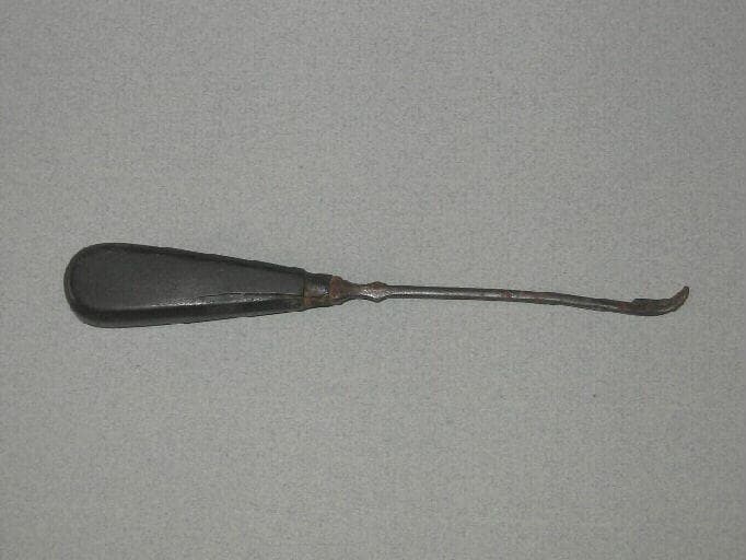 Instrument muni d'une poignée sur laquelle est montée une tige fine terminée par une petite serpette. Manche en ébène ?
