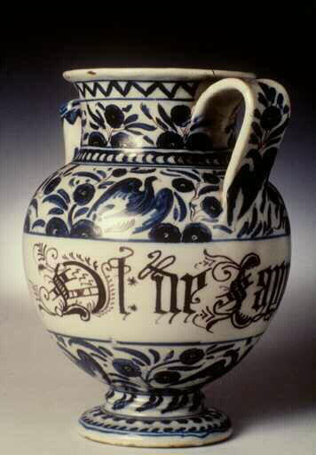 écriteau sur la panse et étiquette collée sous le pied : OL DE LAPPARI [ ou LAPPATI] ; Oleum de lappati ; Huile de patience ; Savone Italie 1ère 1/2 du XVIIe siècle