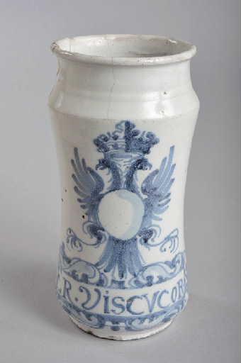 Ecriteau sur le bas de la panse et étiquette collée sous le pied ER. VISCUCOR ; Eryngium viscuror ; racine de panicaut ; Centre Hospitalier Régional de Rouen N° 395 de l'inventaire spécial des objets de valeur effectué en 1949 ; Tavalera Espagne 18es