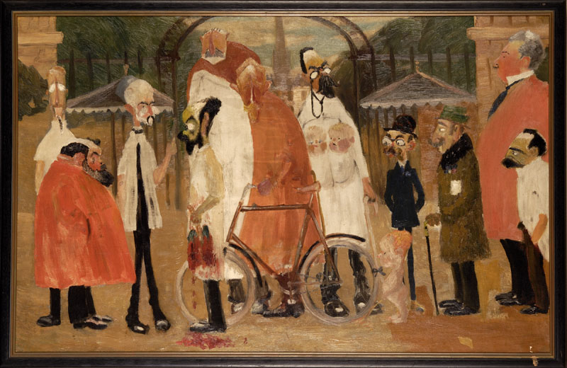 Groupe de onze médecins en habit de ville ou en blouse blanche. La scène se situe en extérieur, on distingue au fond la flèche de la cathédrale de Rouen. On aperçoit une grande grille, deux sortes de kiosques et des pans de murs en pierre de taille, il s'agit de la cour de l'Hôtel-Dieu donnant sur l'avenue Gustave Flaubert. Les personnages, traités de manière caricaturale, sont soit très maigres et petits, soit très grands et assez enveloppés. Les couleurs vives sont disposées en larges touches, les contours sont parfois peu précis. De gauche à droite sont représentés : - en arrière plan, un personnage maigre à lunettes, en blouse blanche, est Charles Bataille (1859-1923), médecin et chirurgien des hôpitaux de Rouen, professeur d'anatomie en 1901, président de l'Association des médecins de la Seine-Inférieure. - en avant, le petit personnage enrobé au manteau orange n'est pas indentifié. - ensuite on reconnaît le docteur Alfred Cerné (1856-1937), chirurgien des Hospices Civils de Rouen, fondateur du laboratoire de radiologie en 1899. Face au dr Cerné, de profil gauche, se trouve Félix Dévé (1872-1952) tenant des poumons sanguinolants car c'était l'un des domaines de ce grand médecin rouennais. - derrière, en second plan, deux grands personnages forment une masse rouge et orange. Il s'agit, en avant, du docteur Didier qui tient son vélo, son moyen de locomotion paraît-il. Le Dr Didier fut médecin à la maternité Boucicaut fondée pour les filles mères en 1900. L'autre grand personnage en rouge est Constant Petitclerc (né en 1856), médecin des hôpitaux de Rouen en 1880. - ensuite, un médecin à lunettes, barbu, porte deux bébés sur son ventre, il s'agit d'Albert Martin (1866-1948), obstétricien, médecin du service clinique de la maternité de l'Hospice Général. A. Martin fonda une maison de santé chirurgicale spécialisée dans les maladies des femmes qui deviendra la clinique Saint-Hilaire. - puis vient un groupe de trois petits personnages, dont un non identifié à l'extrême droite. Le docteur Louis Née vu de face porte des lunettes. Médecin à l'Hôtel-Dieu, professeur de pathologie, directeur de l'école de médecine (1937-1944), il fut conseiller municipal à Rouen en 1923 et à l'origine d'une réforme dans l'organisation des hôpitaux de Rouen. A côté, de profil, se tient Raoul Brunon (1854-1929). Il fut directeur de l'école de médecine pendant plus de 28 ans et fondateur du musée Flaubert et d'histoire de la médecine en 1901. Il se préoccupa beaucoup de questions d'hygiène, notamment pour la petite enfance, c'est peut-être pour cela qu'est représenté devant lui un enfant, sorte de Mannekenpis. - enfin, un grand personnage à manteau orange semble répondre au petit bonhomme à l'autre extrémité, vêtu d'un costume de la même couleur. Ce grand homme est Adolphe Hébert (1867-1961). Issu d'une famille de tisserands, il entra à l'Hospice Général comme préparateur dans le laboratoire de E. Blanche, puis de Charles Nicolle, qui l'encouragèrent à étudier la médecine. En 1899 il est adjoint au médecin-chef C. Nicolle, à qui il succède en 1902 après son départ pour Tunis