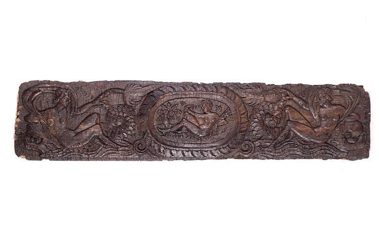 Au centre dans un médaillon est assise, jambes repliées, Aphrodite, le corps vu de face mais le visage figuré de profil gauche. Elle tient dans la main gauche une sorte de corne ou une palme (?) et de l'autre main semble saisir le cou d'un animal. Un bouquet de fleurs se trouve dans la partie gauche du médaillon. De part et d'autre deux néréides sont adossées à un monstre marin à écailles dont la queue s'enroule. Chacune retient une draperie gonflante qui passe derrière la tête. L'eau est représentée par des incisions ondulées