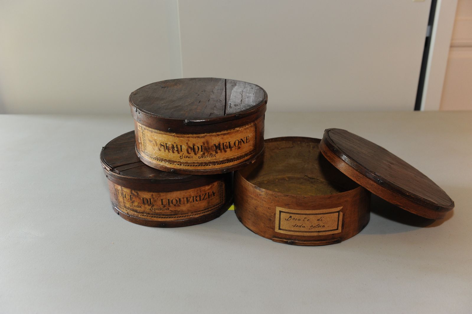 Sur chacune des boîtes figure une étiquette, imprimée ou manuscrite, décrivant son contenu : Semi di melone [traduction : Graines de melon] / Radice di liquerizia [traduction : racines de réglisse] / Borato di soda ofsia [traduction : Borate de sodium ?]
