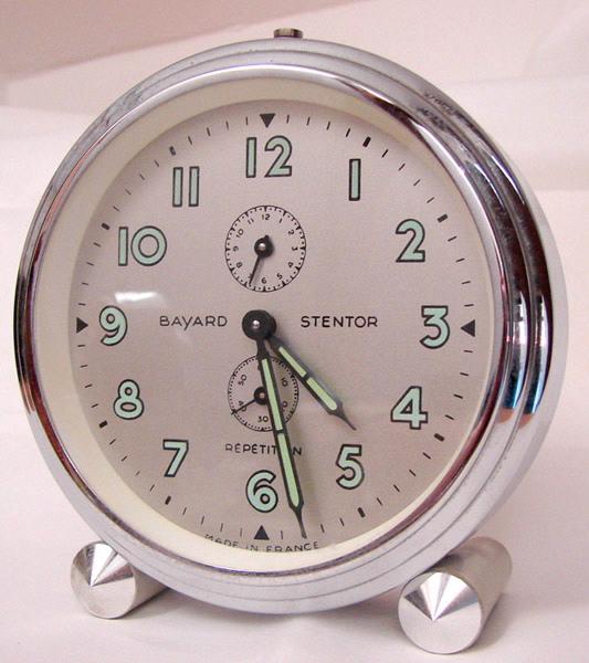 Il s'agit d'un réveil Bayard modèle Stentor, équipé d'un mouvement GR 200 à sonnerie de réveil à répétition. Le mouvement mécanique est logé dans un boîtier en tôle emboutie nickelée-chromée de 13.5 cm de diamètre. Au sommet du réveil, se trouve le bouton 'arrêt sonnerie réveil'. L'ensemble repose sur deux pieds coniques gainés en plastique gris clair et dont l'embout est en aluminium poli. Le cadran gris argenté est composé de chiffres arabes fluorescents et possède deux aiguilles fluorescentes en forme de lance. Le cadran possède deux petits cadrans : un cadran de réveil en dessous du chiffre '12' et un cadran pour la trotteuse au dessus du chiffres '6'. En bordure de cadran principal, une graduation indique les minutes. Le cadran comporte les inscriptions 'BAYARD', 'STENTOR', 'REPETITION' et 'MADE IN FRANCE'