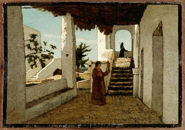 Une fillette filant à sa quenouille au pied d'une terrasse ; Huile sur bois