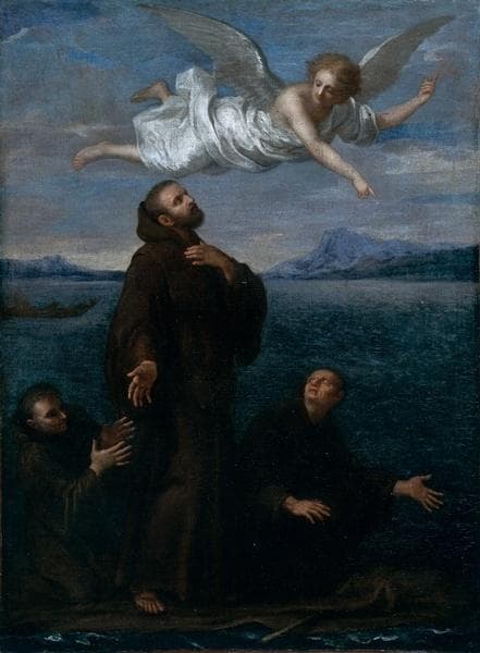 Saint François de Paule passant le détroit de Messine sur son manteau avec deux de ses sompagnons, sous la conduite d'un ange