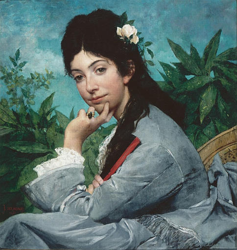 portrait (femme, assis, à mi-corps, éventail, plante)