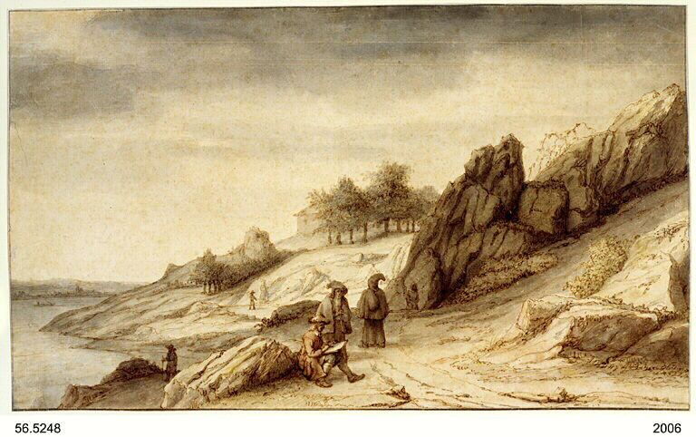 Doomer représente sur ce lavis cette butte rocheuse assez aride sur laquelle une 'rabine' (boqueteau) apportait de l'ombre. Il a figuré son compagnon de voyage Schellinks occupé à dessiner lui aussi sur le motif et 2 moines, c'est à dire la moitié de cette petite communauté qui vivait de ses cultures et surtout du produit des quêtes