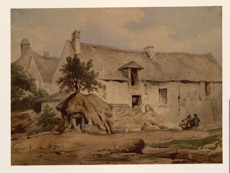 vue d'architecture ; paysage (ferme, cour, personnage)