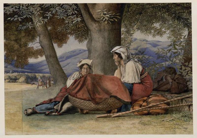 scène (femme, assis, repos, berceau, voyageur : sac, homme, couché, accoudé, bâton : la marche, costume traditionnel : Italien) ; fond de paysage (colline, tronc, feuillu, transport à dos d'animal, âne, femme : portage, chemin, Italie)