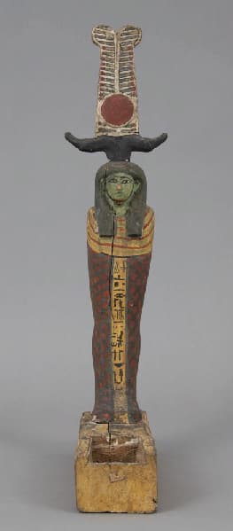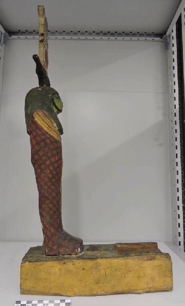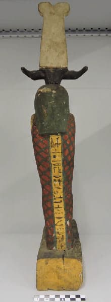 Figurine en bois sculpté, stuqué et peint. Aucune analyse micrographique du bois n'a été réalisée. Son aspect s'apparente cependant à un bois de figuier sycomore. (Laure de Guiran, restauration janvier 2017). ; L'ensemble est constitué par divers éléments taillés séparément et assemblés : 1. la statuette est taillée dans une seule pièce de bois. 2. la couronne Henou est constituée de deux éléments assemblés : les cornes et les plumes. 3. Le socle avec son réceptacle sont également taillé dans une seule pièce de bois. Le réceptacle taillé directement sur le socle ( L : 11 cm l : 7 cm H : 4.5) avait une fermeture qui a aujourd'hui disparue. Osiris est fixé sur le socle à l'aide d'un tenon de section carré taillé dans la même pièce de bois qui vient s'insérer dans une sorte de mortaise carrée taillée dans le socle. Les cornes sont assemblées sur le dessus de la tête d'Osiris à l'aide d'une cheville qui s'insère dans un percement taillé à cet effet. Les plumes sont assemblées à l'aide de deux chevilles. La surface picturale originale, actuellement visible, est appliquée sur une couche de préparation blanche. Seul l'intérieur du réceptacle n'est pas polychrome. Le socle est peint en ocre jaune. Le corps de la statuette d'Osiris est ocre rouge recouverte d'une résille bleu, les cheveux sont bleu et les carnations vertes. Les cornes sont bleues alors que la plume est blanche avec des décors ocre rouge et bleu et un dessin tracé en noir. (Laure de Guiran, restauration de janvier 2018).