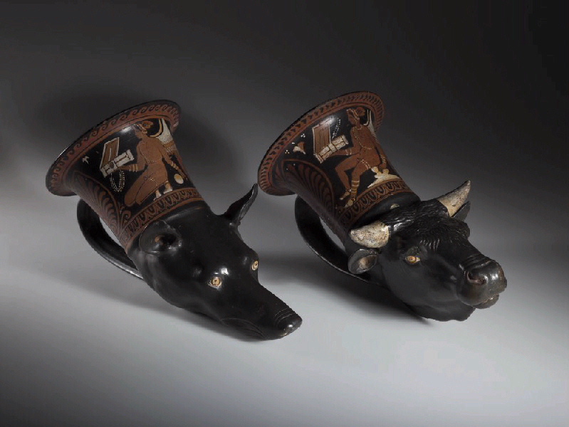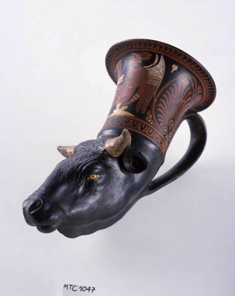 Rhyton à tête de taureau à l'Eros tenant un coffret ; Rhyton à tête de bouvillon (Titre de la notice de Catherine Lesseur, 2005-2006) ; Tête de taureau avec représentation d'Eros (Titre de la notice de Catherine Lesseur, 2005-2006)