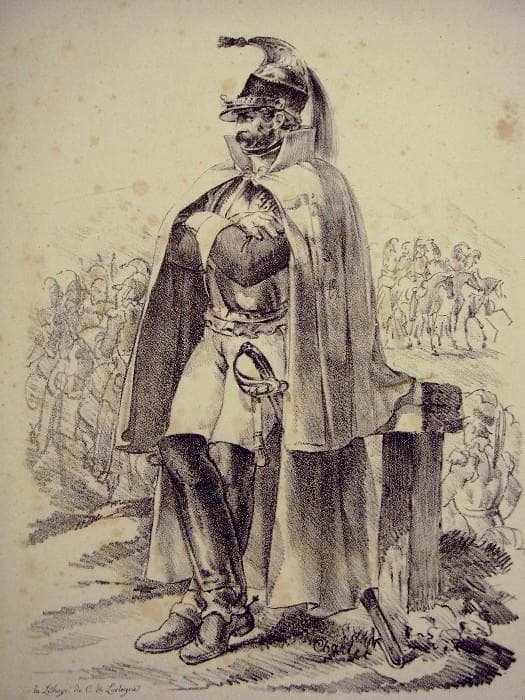Cette lithographie compte parmi la série des costumes militaires. Dix-sept pièces ont été imprimées chez Lasteyrie de 1817 à juillet 1818. ; voir aussi : Recrue de l'exercice (2008.0.97) , Sapeur d'Infanterie (2008.0.98) , Grenadier de la Garde Impériale (2008.0.93) ; Ces deux pièces comptent parmi les dix-sept lithographies imprimées par Lasteyrie de 1817 à 1818, dans la série des costumes militaires.