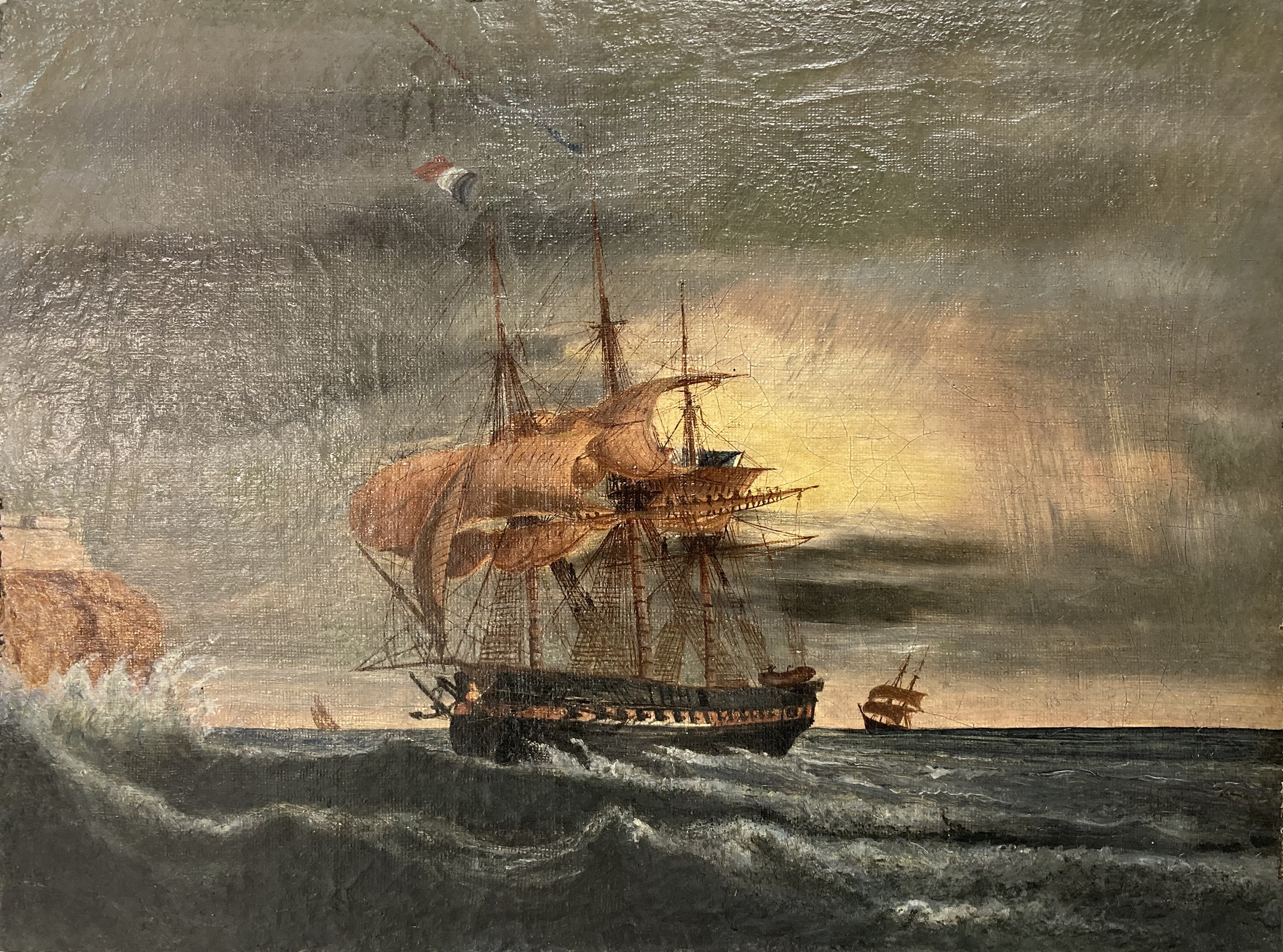 Peinture marine du trois mâts 'La Belle Poule' (3e du nom) en pleine mer. Construit en 1834, il ramena les cendres de Napoléon Ier de Ste Hélène en 1840