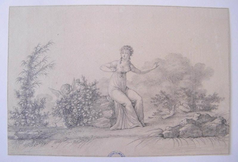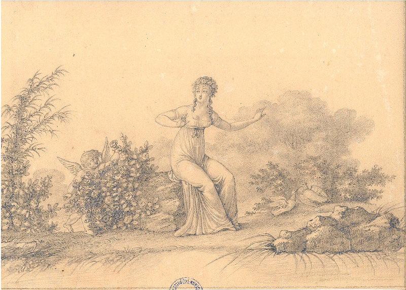 Portrait d'une femme assise dans un jardin sur un rocher, habillée à la mode Consulat-1er Empire (Merveilleuse). Elle se retourne, surprise par l'apparition de Cupidon, caché derrière un buisson de roses.