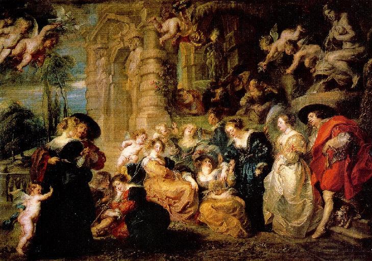 La tradition des Jardins d'Amour trouve son origine dans l'art de la fin du Moyen Age, et était souvent une célébration de l'union matrimoniale. Le peintre célébrait sa récente union avec Hélène Fourment, à travers une oeuvre allégorique, psychologique et poétique. Cette oeuvre occupe une place à part dans les Jardins d'Amour du 17e siècle. Antoine Watteau s'inspira de Rubens pour ses fêtes galantes. N°32 du Catalogue de 1926: Dans un jardin décoré d'un portique d'architecture à bossages et d'une fontaine jaillissante, se rencontrent, se groupent ou s'isolent en couple d'élégants cavaliers et des dames en costumes du temps de Louis XIII. Des Amours voltigent autour d'eux. C'est Décaméron de Boccace arrangé à la manière flamande.