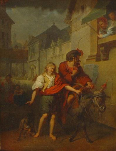 scène (ville, meunier, jeune homme, âne, rue, maison)