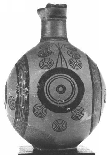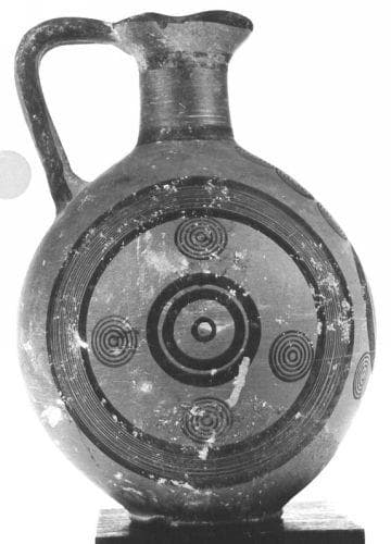 Pâte rouge orangé. Surface orangée lustrée. décor peint brun-noir. Anse bifide faite de deux boudins de pâte soudés sur toute la longueur de l'anse. ; Panse sphérique, col cylindrique, ouverture pincée, lèvre mince. Anse bifide de la lèvre à l'épaule. L'organisation du décor est circulaire et verticale. et le dessin est exécuté tantôt au trait fin, tantôt au trait épais. Sur chacune des faces: petit anneau central cerné de deux cercles épais, puis quatre petits disques multiples disposés alentour. De grands cercles faits de lignes limitées par des bandes ferment la composition. Un motif de faisceaux sur l'épaule du côté opposé à l'anse est entouré de part et d'autre de trois petits disques multiples superposés et trois autres également superposés figurent au-dessous, dans l'axe vertical des faisceaux. Sous l'anse, deux petits disques concentriques disposés l'un au-dessous de l'autre.