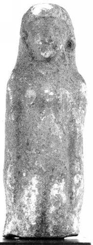 Pâte beige très dure. Revers lissé, légèrement creusé. ; L'attitude est frontale. longs bras tenus serrés contre le corps, avec indication des doigts. Les seins sont notés plastiquement. Les cuisses sont jointes. Du visage, on ne voit plus que la forme générale, laquelle est triangulaire et on note que la chevelure est ramenée en boucles en avant, sur le front. Des pendants ornent les oreilles et sur la poitrine, on distingue un grand collier triangulaire à pendentif. Les autres figurines de ce type portent un long vêtement transparent, le mauvais état de celle-ci empêche d'en vérifier l'existence.