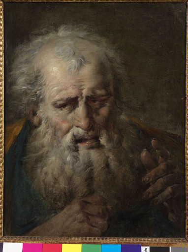 Vieillard barbu vu en buste, au visage très expressif, représenté de face, le regard dirigé vers la gauche, des larmes coulent de ses yeux et il semble parler : la bouche est entr'ouverte. Son poing droit est fermé et sa main gauche accompagne sa parole. Quelques parties du manteau jaune d'or et bleu turquoise sont visibles.