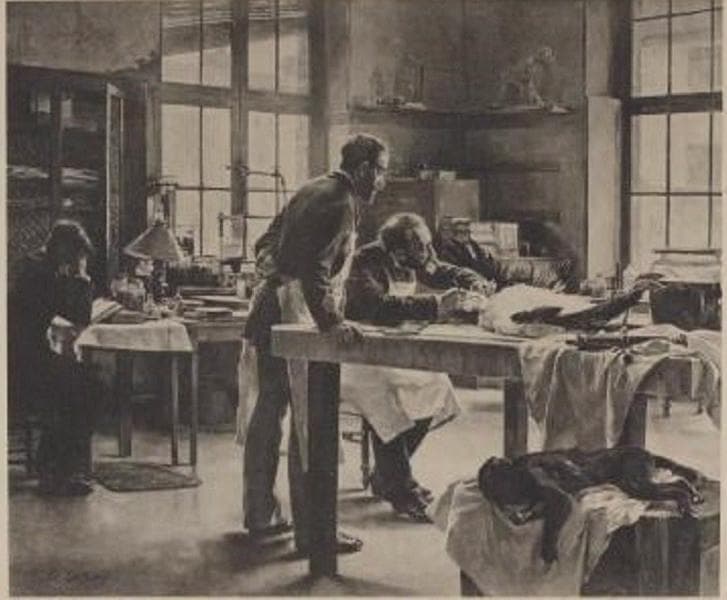A Paris, au Museum, dans le laboratoire d'anatomie comparée (55 rue Buffon), deux hommes portant un tablier blanc sur leur costume, l'un assis, l'autre debout observent l'oiseau qu'ils sont en train de disséquer sur une table. Au premier plan, à droite, un singe mort sur un linge repose sur une sellette. En arrière-plan à gauche, un homme attablé lit un livre devant une lampe. La pièce est éclairée par deux fenêtres. Dans le fond, sont disposés, à gauche une armoire ouverte et divers instruments de chimie.
