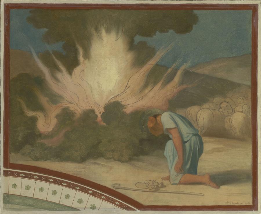 Version définitive pour le décor mural de l'église Saint-Germain-des-Prés à Paris, cette oeuvre illustre un épisode de l'Ancien Testament. Hyppolite Flandrin entreprend en 1856 ce gigantesque chantier avec l'aide de son frère Paul. Dans la nef, puis dans le choeur, il renouvelle l'iconographie avec un souci exigeant de clarté et de synthèse. Pour cela, il est considéré comme le grand peintre religieux du XIXe siècle. Moïse, auréolé, un genou à terre et se protégeant la tête avec son bras est face à un buisson qui s'enflamme, dans lequel on devine une auréole. Il a posé à terre ses sandales et son bâton de berger, ses moutons se trouvent à sa droite. En bas, à gauche représentation d'une partie de l'arc architectural. Selon la Bible, Moïse serait parvenu sur le mont Horeb, la montagne de Dieu, en faisant paître son troupeau. Là, l'ange du Seigneur lui apparaît dans une flamme au milieu d'un buisson, qui brûle sans jamais se consumer. Il retire ses sandales à la demande de Dieu (Exode 3, 5 : ' Retire tes sandales car le lieu que foulent tes pieds est une terre sainte '). Cet épisode biblique raconte donc l'apparition du Dieu éternel à Moïse. Ce type de manifestation divine porte le nom de théophanie.