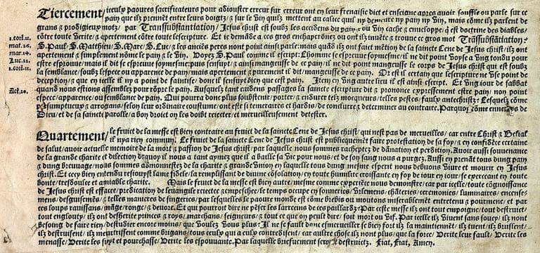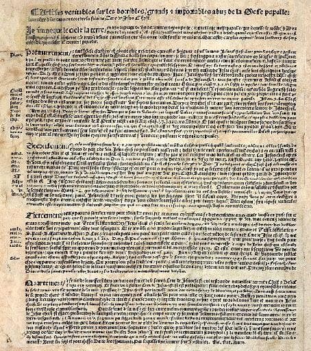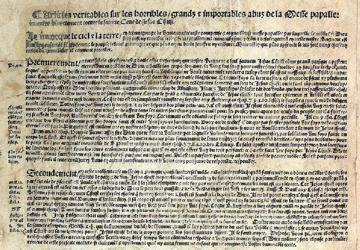 Articles véritables sur les horribles, grands et importables abus de la messe papalle, inventée directement contre la saincte Cène de Jésus-Christ (Titre inscrit) ; Placard contre la messe (Titre habituellement attribué au document)