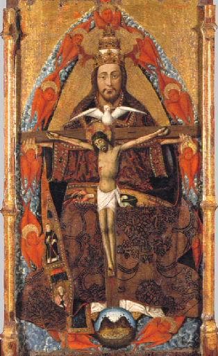 Peinture à la détrempe et fond d'or sur bois (résineux).; Le panneau figure 'La Sainte Trinité' selon l'iconographie traditionnelle en Europe occidentale et à Valence à la fin du Moyen Âge. Dieu le Père est assis, de face, couvert d'une tiare papale, vêtu d'une dalmatique et d'une chape de brocart à motifs végétaux. Les plis de la chape laissent apparaître des orfrois brodés de figures de saints : à gauche, de haut en bas, saint André (croix), sainte Catherine (roue) et un(e) saint(e) non identifié(e); sur le pan rabattu sur les genoux de gauche à droite, sainte Lucie (yeux) ou sainte Agathe (seins), et un saint tonsuré non identifié. Les manches de la tunique et le col sont ornés de pierres précieuses et les chaussures, dont la pointe apparaît sous l'aube, sont brodées d'une croix. Entre les pieds de Dieu est placée l'image du globe terrestre, marquée des trois continents à l'image de la Trinité, où apparaissent la mer, la terre (deux montagnes plantées d'arbres) et le ciel. Dans ses mains écartées, le Père éternel porte le bras horizontal de la croix, dressée sur le globe, sur laquelle est cloué le Christ mort. L'Esprit Saint, ailes déployées, est posé sur le sommet de celle-ci. Les trois figures sont contenues dans une mandorle de nuées composée de onze séraphins. En bas, le fonds du panneau est occupé par des nuages tandis qu'en haut, le fond doré est orné de décors géométriques ou végétaux, guillochés, formant le long des bords droit et gauche deux bandeaux verticaux. La même technique de motifs imprimés a été utilisée dans les trois auréoles qui nimbent les figures trinitaires comme les rayons qui émanent du Père. Les bords latéraux sont renforcés par des montants cannelés et dorés, contemporains de la peinture. Le panneau est amputé, en haut et en bas, de ses anciennes bordures. L'oeuvre constituait sans doute le pinacle central d'un retable, comme il est d'usage pour les calvaires réalisés par le binôme Jacomart - Reixach. Longtemps attribué à Jaime Baço, dit Jacomart (Valence, vers 1411- Valence, 1461), maître quasi mythique de l'école de Valence au XVème siècle, le panneau est réattribué aujourd'hui à son proche collaborateur, Juan Reixach, attribution confirmée par Gennaro Toscano (com. orale, 1998). L'oeuvre de Reixach a été largement confondu avec celui de son maître, avec qui il s'est souvent associé pour des commandes et dont il a parfois terminé les travaux. La découverte de la signature de Reixach sur le 'Retable de sainte Ursule' (Barcelone, musée des Beaux-Arts de Catalogne), daté de 1468, a servi de base à la reconstitution du corpus de cet artiste (Dictionnaire de la peinture espagnole (...), 1989, p.235). 'Un esprit encore très gothique', un goût certain pour le détail et 'un fort accent flamand' (Ressort, 1986, pp. 225-257), sans doute hérité de Jacomart qui l'avait lui-même acquis lors de son séjour à Naples (vers 1445-1450), cité très marquée par cette influence, caractérisent le travail de Reixach. L'image du Crucifié est particulièrement proche de figures équivalentes visibles dans d'autres panneaux sûrs (Retable de sainte Ursule de Barcelone, Perez Sanchez, 1994, p.169) ou attribués à ce maître, comme dans celui appartenant au musée Goya à Castres, ou d'autres conservés à la cathédrale de Segorbe, à l'église de Cati ou à la Norton Simon Foundation de Los Angeles (Ressort, 1986, pp.255-256). Une composition assez proche se retrouve dans un tableau du palais des Beaux-Arts de Lille. Notice de Matthieu Pinette