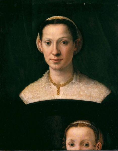Le modèle de ce portrait demeure anonyme. Vêtue, parée et coiffée à la manière des dames de la société florentine vers le milieu du XVIe siècle, cette femme serait selon F. Bologna (com. écrite, rapportée par Laclotte dans cat. exp. Paris, 1965-1966), le même modèle que celui représenté à des âges différents dans trois oeuvres attribuées respectivement à Pier Francesco Foschi (actif à Florence au XVIe siècle) (Amsterdam, Rijksmuseum), Pontormo ou son atelier (Paris, musée Jacquemart-André) et Tosini (Florence, Palais Pitti). Une radiographie et une restauration effectuées en 1966 ont révélé la partie supérieure de la tête d'une fillette en bas à droite ; la raison de la mutilation du panneau dans la partie inférieure n'est pas expliquée (adaptation à un cadre ou accident ?) ; en revanche la date du repeint doit être située entre 1861 (apparition du tableau à la vente Daigremont avec partie supérieure du visage de la fillette) et 1894 (date de publication du catalogue du musée où seul le portait de la mère est signalé). Cette oeuvre est entrée au musée comme étant de Cristofano Allori (Florence, 1577 - Florence, 1621), puis a été attribuée par Berenson (1932) à Jacopo Carruci, dit Il Pontormo (Pontormo, 1494 - Florence, 1556) ; cette dernière attribution a été finalement abandonnée par l'historien lui-même. Tout en plaçant l'oeuvre parmi les anonymes florentins du deuxième quart du XVIe siècle influencés par Pontormo, Laclotte (1965-1966) établit un parallèle avec le Portrait de jeune homme du City Art Museum de Saint Louis successivement donné à Francesco de' Rossi, dit Salviati (Florence, 1510 - Rome, 1563), Carlo Portelli (Loro Ciuffenna, ? - Florence, 1574) ou Michele Tosini (Florence, 1503 - Florence, 1577) ; il se prononce avec beaucoup de prudence pour cette dernière hypothèse (qui recoupe l'attribution d'un autre portrait de cette même femme à cet artiste). En 1966, Shearman avance le nom de Tommaso Manzuoli, dit Maso da San Friano (San Friano, 1536 - Florence, 1571), idée reprise par Cannon Brookes (1966) qui date le panneau avant 1556 et donne au même auteur le portrait d'Amsterdam déjà cité. Adoptée par Auffret (1982-1983), cette idée semble aujourd'hui abandonnée par la critique qui préfère maintenir l'oeuvre dans l'anonymat plutôt que de trancher dans le délicat problème des portraits florentins du milieu du XVIè siècle. Notice de Matthieu Pinette