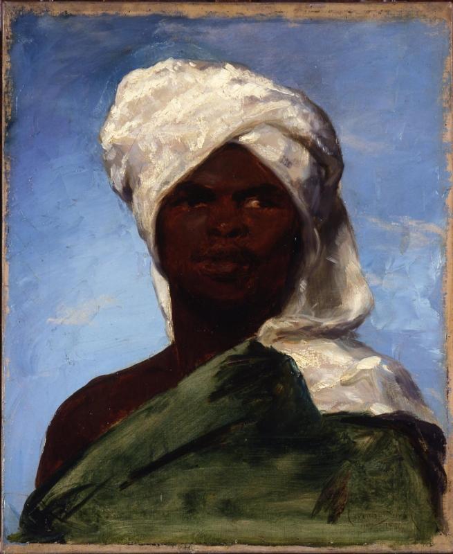 Huile sur toile ; Atypique dans la production de Carolus-Duran, portraitiste à succès volontiers qualifié de « mondain », cette toile traduit l'attrait exercé par l'orientalisme sur les artistes tout au long du siècle. Si les peintres furent d'abord largement séduits par les accessoires fastueux liés à l'Orient, Un Soudanien illustre toutefois l'évolution profonde du regard porté ensuite par les artistes sur le monde extra-européen. À partir de la fin des années 1850 et des travaux du sculpteur Charles Cordier (Cambrai, 1827 - Alger, 1905), les représentations des hommes et femmes originaires d'Afrique revêtirent une dimension plus scientifique, plus anthropologique que par le passé. L'oeuvre de Carolus-Duran, dépourvue du moindre détail gratuit, met l'accent sur la noblesse du modèle plus que sur un quelconque folklore. Vraisemblablement réalisé en atelier, dans la mesure où l'artiste ne traversa jamais la Méditerranée, ce portrait s'apparente à une tête d'étude : c'est finalement le type incarné par le modèle, davantage que le modèle lui-même et son environnement, qui prime ici. Notice de Laure Dalon, 2010