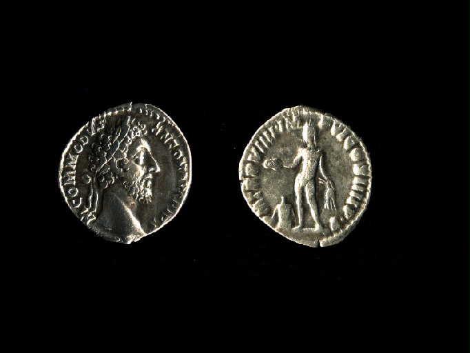 Légende à l'avers : M. COMMODUS ANTON AUG PIUS pour Marcus Commodus Antoninus Augustus Pius (le pieux Auguste Marc Commode Antoine) ; Légende au revers : PM TRP VIIII IMP VI COS IIII P.P pour Pontifex Maximus Tribunicia Potestate Nonum Imperator Sextum Consul Quartum Pater Patriae (Grand Pontife, détenteur de la puissance tribunitienne pour la 8e fois, Imperator pour la 6e fois, Consul pour la 4e fois, Père de la Patrie)