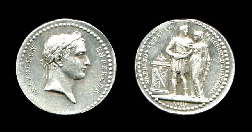 Sur le modèle romain du quinaire, l'empereur Napoléon fit frapper des jetons en argent qu'il jeta à la foule le jour de son mariage. La gravure est d'une grande qualité.