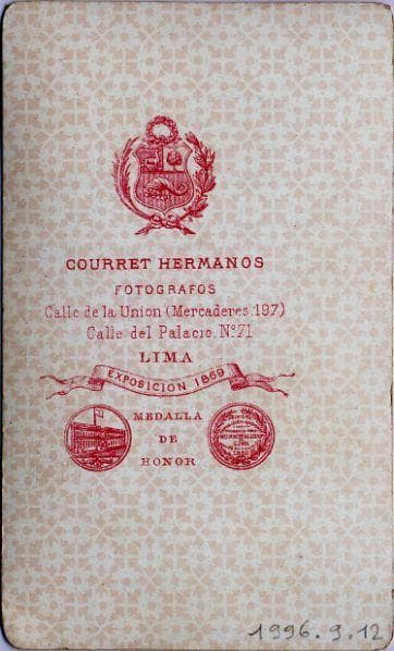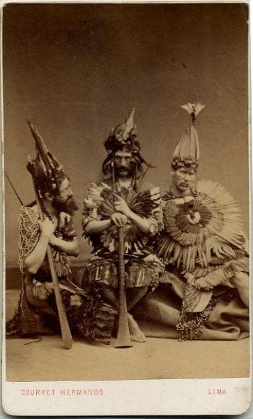 Eugène Courret, photographe français établi à Lima depuis environ 1860, avait fait un voyage à Tahiti entre 1863 et 1864 et peut-être avait-il été séduit par certains de ces costumes et en avait-il rapportés ? Mais plus probablement il pourrait s'agir de quelques marins de retour d'une mission dans le Pacifique qui voulaient immortaliser leur voyage. En effet les navires de guerre français de la station navale du Pacifique faisaient souvent escale à Callao (le port de Lima) avant d'aller en Polynésie ou en revenant
